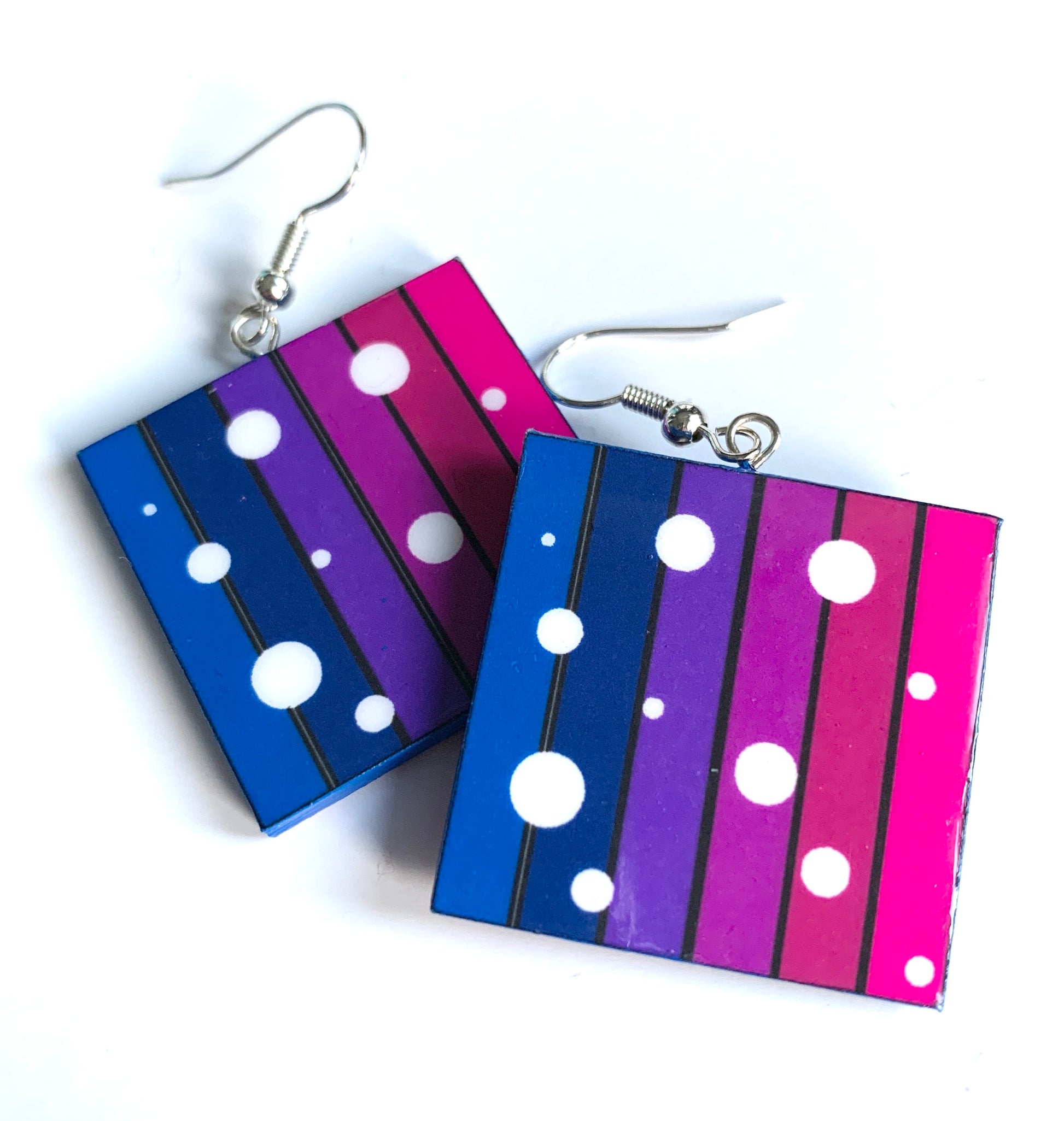 "Showcase your unique style with our Stripe square shaped paper earrings. These colorful earrings feature a striped rainbow design, transitioning from pink to blue. The square shape adds a modern touch, while the spotted pattern adds a playful element. Stand out in any crowd with these eye-catching earrings."